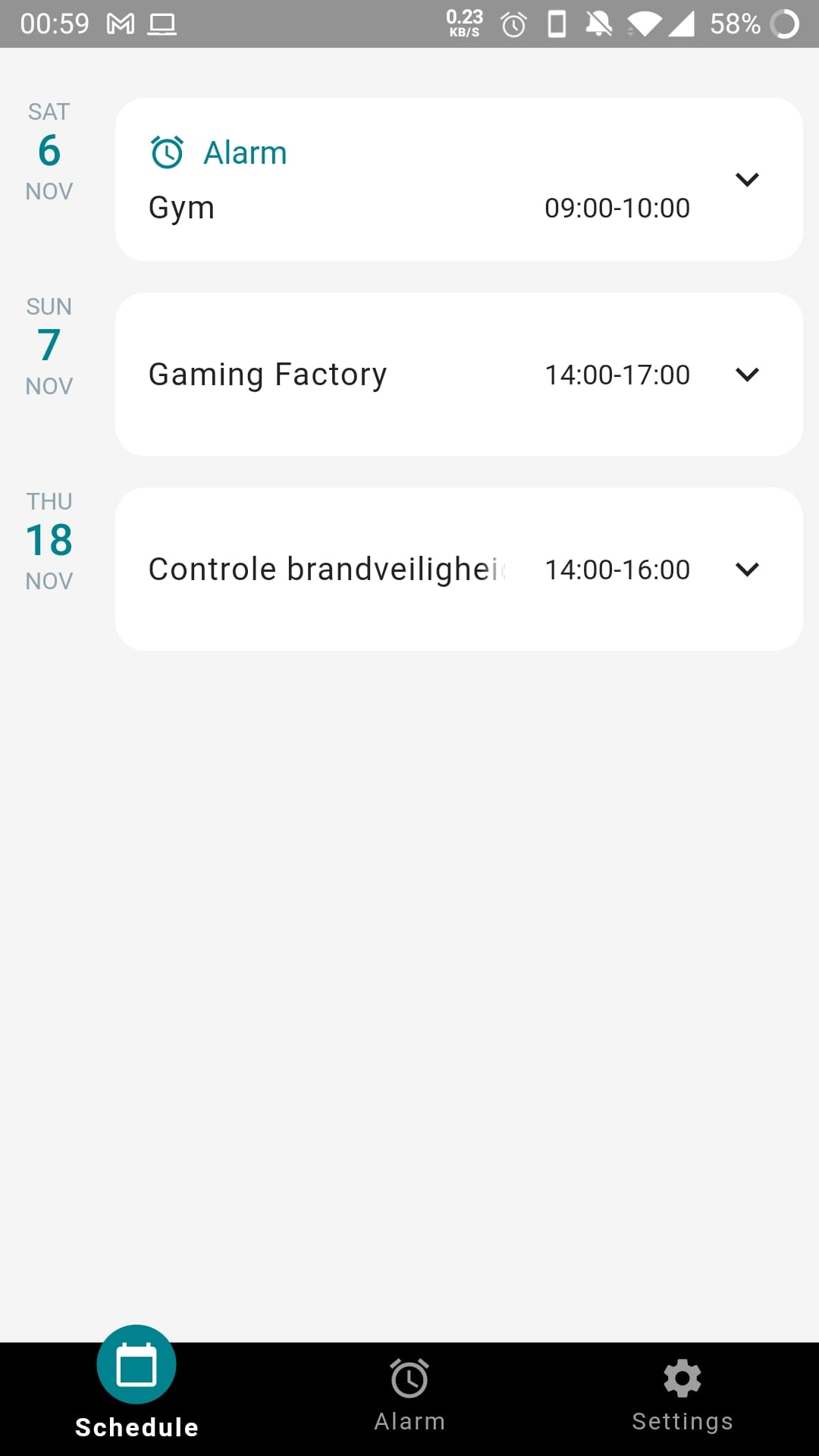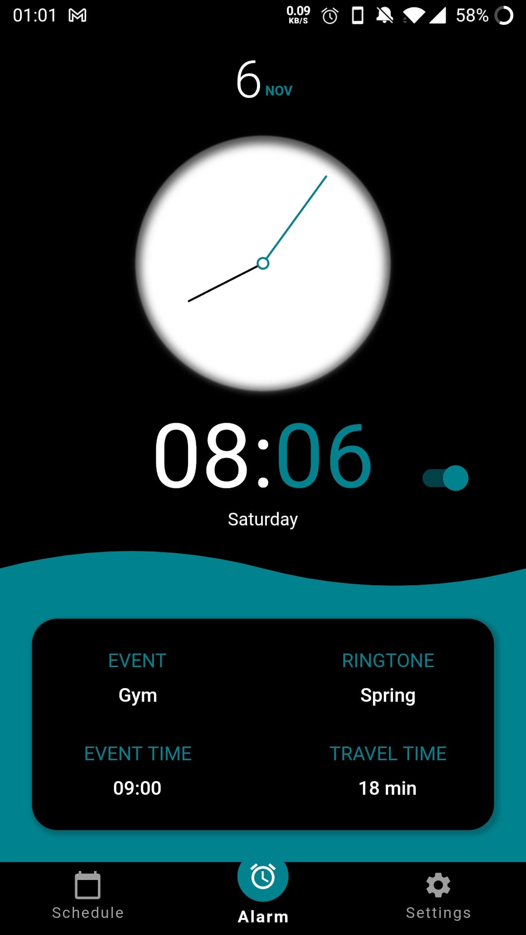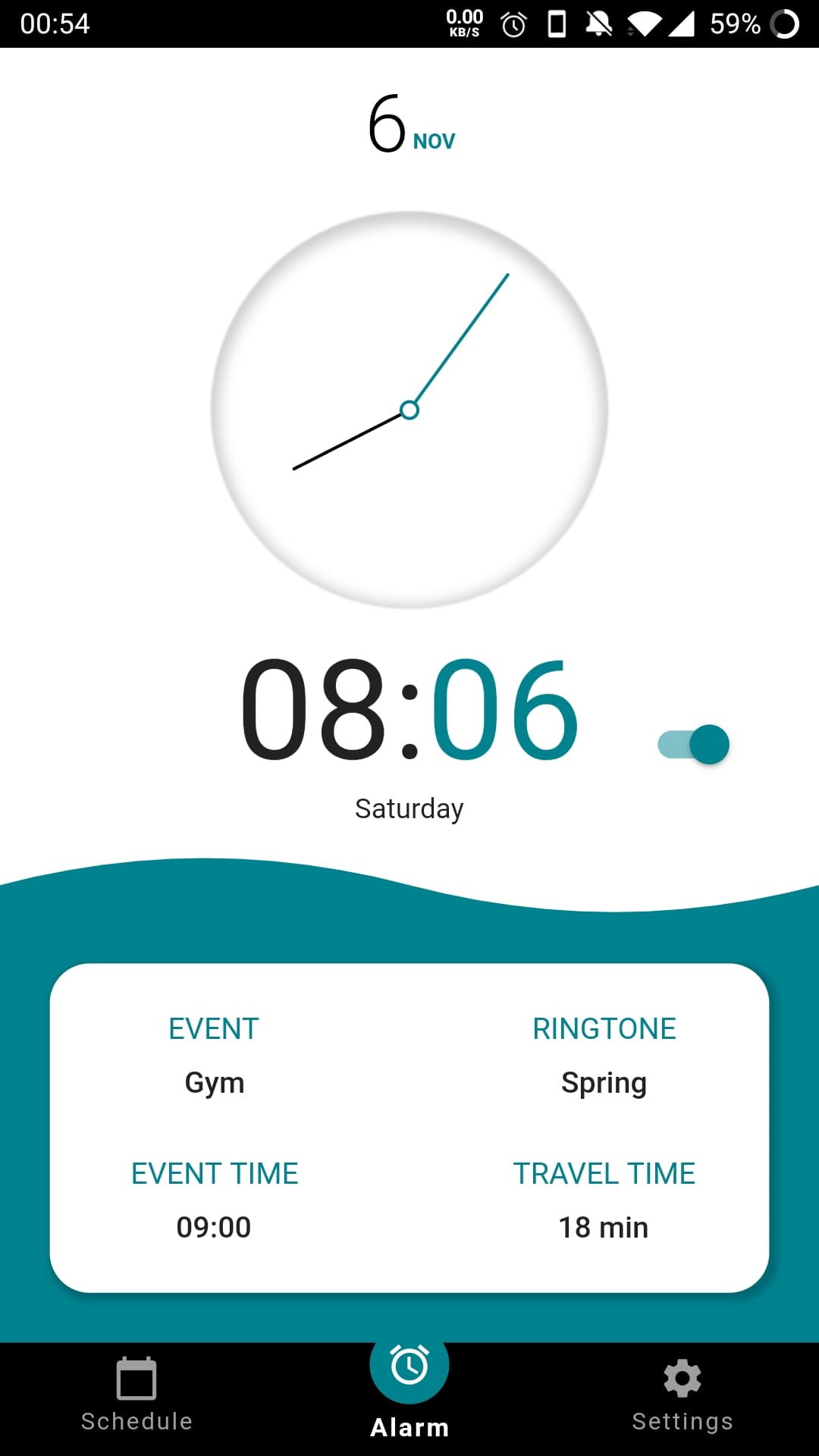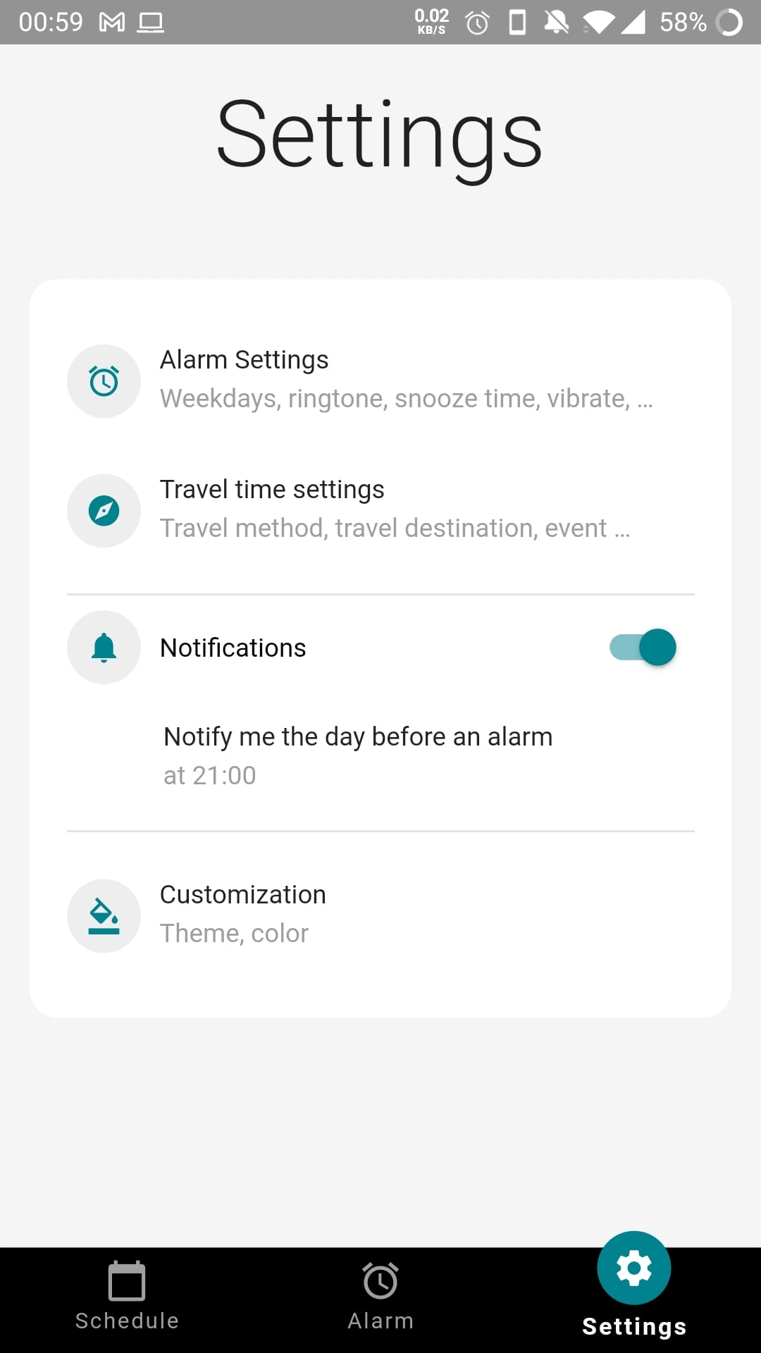 For scheduling alarms, the app considers any additional wake up time (e.g. for breakfast) and travel