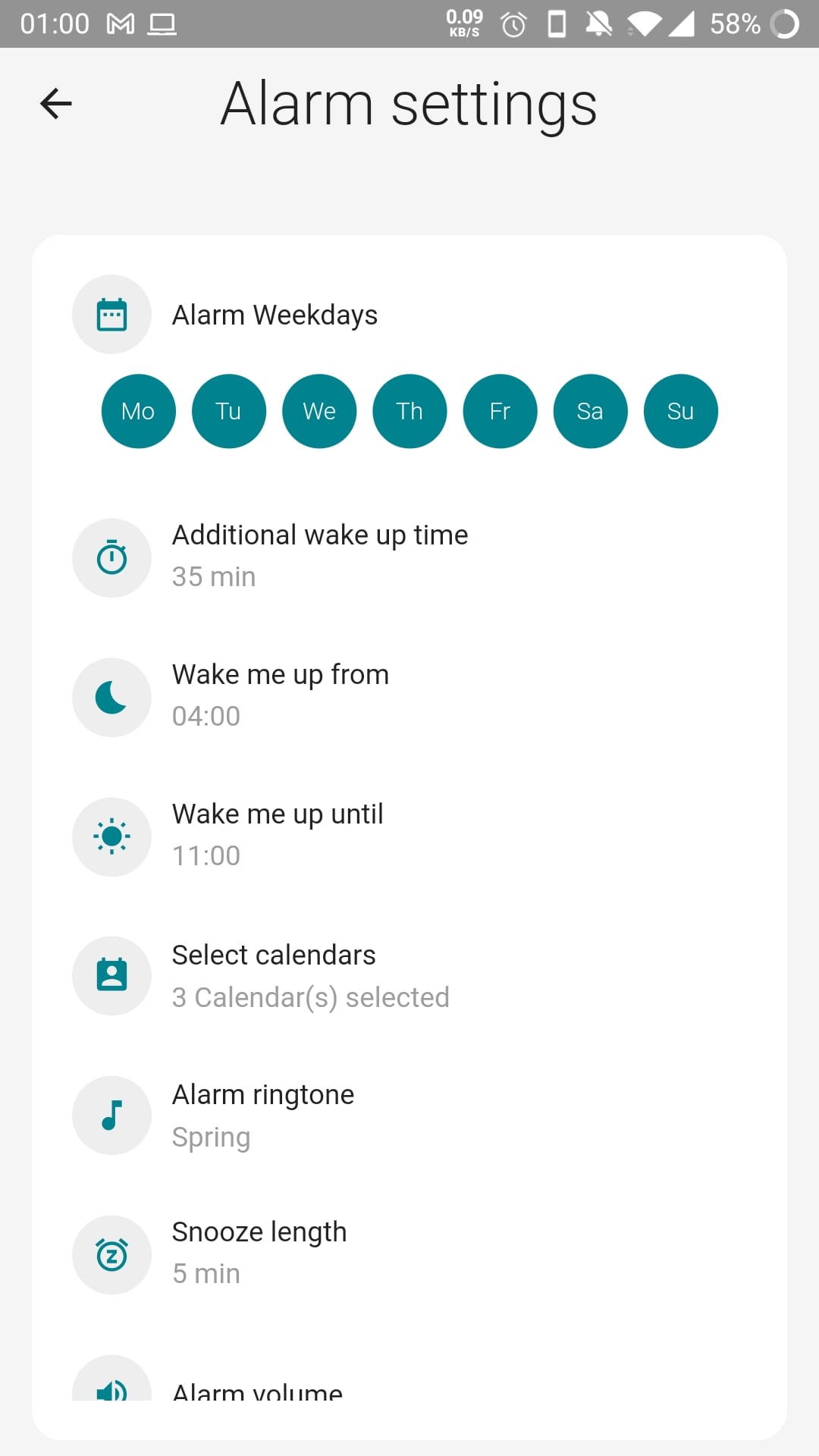 the alarm ringtone, what days to schedule automatic alarms, snooze length, vibration settings, alarm
